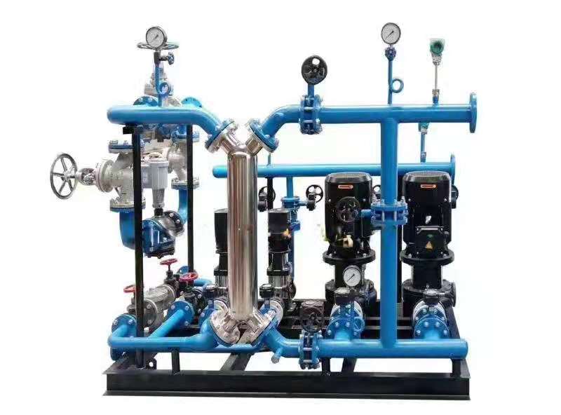 ? ? ? ?全自動(dòng)換熱機(jī)組主要是由換熱器、溫控閥組、疏水閥組(熱媒為蒸汽時(shí))循環(huán)泵、電控柜、底座、管路、閥門(mén)、儀表等組成,另外還可以換熱器、溫控閥組、疏水閥組(熱媒為蒸汽時(shí))循環(huán)泵、電控柜、底座、管路、閥門(mén)、儀表等。全自動(dòng)換熱機(jī)組具有標(biāo)準(zhǔn)化、模塊化的設(shè)計(jì),配置齊全,安裝方便,運(yùn)行可靠,操作簡(jiǎn)便直觀等優(yōu)點(diǎn)。全自動(dòng)換熱機(jī)組自動(dòng)補(bǔ)水,自動(dòng)定壓。補(bǔ)水泵可全自動(dòng)運(yùn)行和手動(dòng)控制啟停,系統(tǒng)穩(wěn)壓值可根據(jù)實(shí)際自由設(shè)置和調(diào)整。二臺(tái)水泵時(shí)補(bǔ)水泵可交替運(yùn)行。冷凝水充分回收,循環(huán)利用,整個(gè)系統(tǒng)水自潔防垢,換熱器、散熱器及換熱系統(tǒng)可保持長(zhǎng)效穩(wěn)定熱交換性能,大幅度降低系統(tǒng)結(jié)垢現(xiàn)象,不會(huì)因難以克服的結(jié)垢弊端而降低系統(tǒng)換熱效率。全自動(dòng)換熱機(jī)組還配備了電磁閥、安全閥二級(jí)超壓保護(hù)裝置,系統(tǒng)超壓時(shí),電磁閥先打開(kāi)泄壓,若電磁閥有故障,安全閥開(kāi)啟泄壓,以確保系統(tǒng)壓力的穩(wěn)定及運(yùn)行。