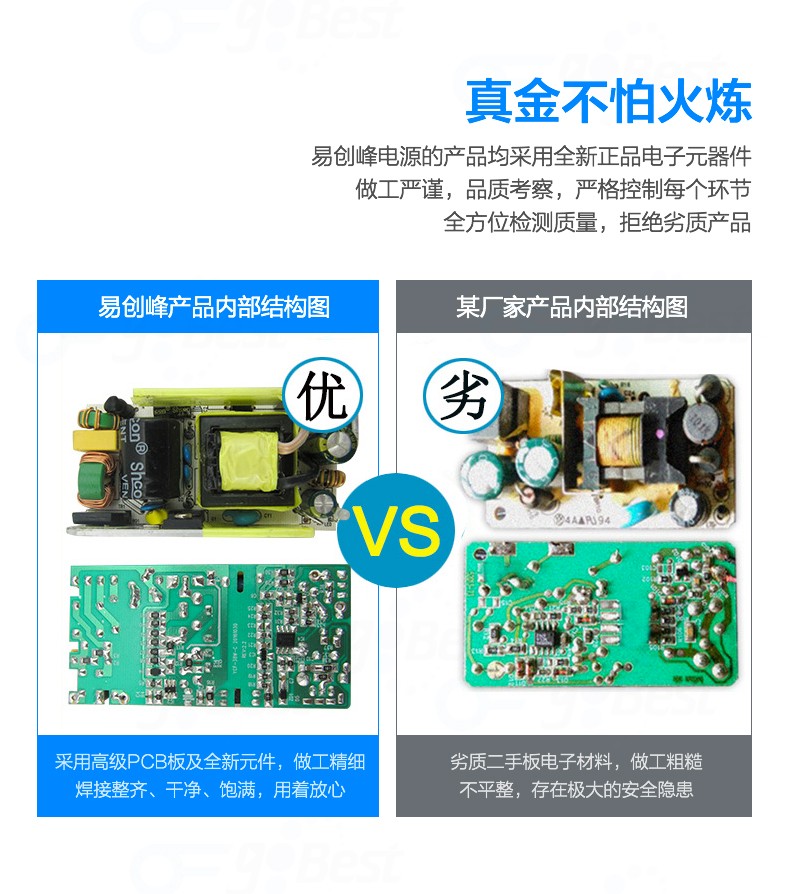 • 采用前沿IC控制方案和先進的制造工藝,高精度,低噪音;過壓,過流,過充,短路等多重保護。