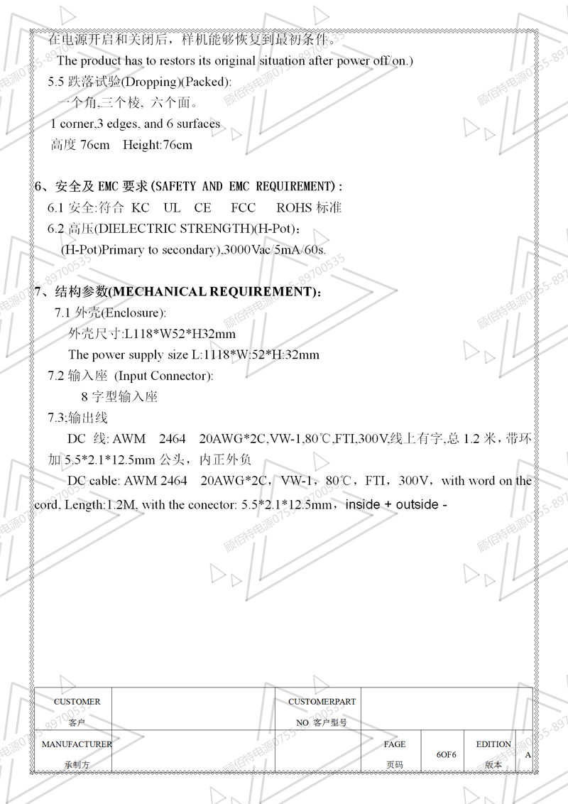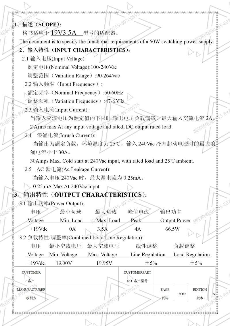 19V3.5A電源適配器規格書